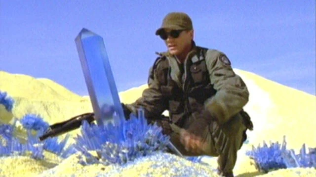 | Durante una misión rutinaria por un planeta desértico descubren unos cristales azules. O'neill es herido por una descarga eléctrica de uno de ellos. Al regresar a la Tierra O'neill desaparece. | |||||