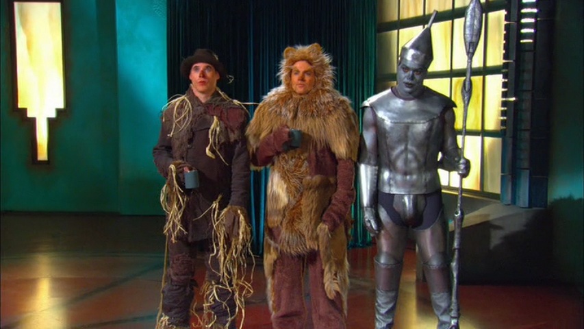 Vala recounts to Martin a story which turns out to be the The Wizard of Oz, a movie that has been referenced in Stargate SG-1 many times since Season 1.[2] In the sequence, Vala is in the role of "Dorothy", Carter the "Good Witch of the North", Mitchell the "Scarecrow", Jackson the "Cowardly Lion", Teal'c the "Tin Man" and Major General Henry Landry the "Great and Powerful Oz". The writers said this is based on the painting of a fan that they have hanging in their office.[2] Some of the little people in this scene also played Furlings at the beginning of the episode.[1] In another fantasy sequence, Vala/Dorothy tells Landry/Oz that, at first, she "thought she wanted to go home", but had decided that she would like to be a regular part of something. The writers said "it's a subtle joke", implying it is indeed a reference to her joining Stargate Command and a meta-reference to the character's recurring role prior to becoming a regular in Season 10. This scene was filmed in the Atlantis Gateroom.[1]