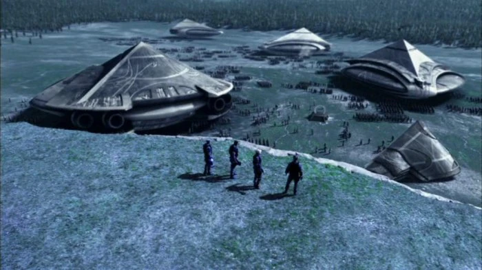 After the "Previously on" sequence has ended, Jackson asks who would make a movie out of a series that only lasted three episodes, to which Teal'c replies that it had strong DVD sales. This is a reference to Firefly,[5] a scifi show that was canceled after airing 11 episodes, but high DVD sales allowed the creation of the feature film Serenity. Martin also threatens to take the movie to another studio if the present one does not like the budget; Joss Whedon actually did switch studios to produce Serenity, moving it from Fox to Universal. Martin also insists, like Firefly/Serenity, that the movie would not use footage from the original series as it is "not a clip show".