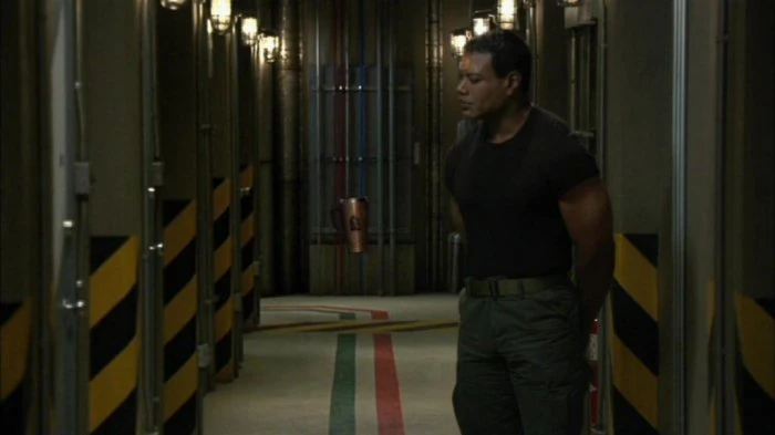 - Teal'c says "I have been reflecting while changing into our gear" without having the team shown to change their uniforms. This is done again later in the episode when CMSgt. Walter Harriman runs to join them at the gate and impossibly switches to a different uniform on the way. A similar gear change occurred in the episode "The Light" when close-to-death Jackson needed to be moved from the Stargate Command infirmary (when he was still in a hospital gown) to another planet, where he was fully dressed in Battle Dress Uniform.