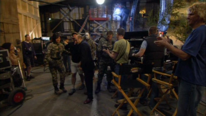 Martin Lloyd receives a cell phone call and tells the fictional cast and crew that they're going to be doing a movie next. The writers had pitched several versions of SG-1 movies over the years, but "our success kind of got in our way."[2] Shortly after this episode aired, two direct-to-DVD movies were announced.