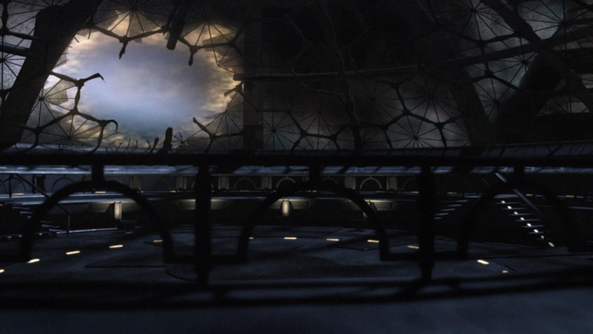 Back on the ship, the groups explore the vast vessel. In Greer's group, Dr. Jeremy Franklin questions if they are really alone on the ship or if another race (possibly one that doesn't breath air) is also aboard. Meanwhile, Scott attempts to apologize to James for earlier, but she doesn't want to talk about it now. Later, they encounter a locked door. Scott decides to call Rush, only to have Eli Wallace answer instead, as he has no idea where Rush went. Scott wants Eli to open a door for him. However, Eli, who later finds out where they are, points out that the door he is located at is red, and notes that red isn't good news. Regardless, he opens it anyway. After seconds, Eli sees the screen flash red. On the other side is a large room with a dome shaped-glass, and there is a massive breach in the section, and it seems shoddily patched up with a Ancient force field. Eli quickly has the door closed, and Scott marks the door with a piece of chalk, meaning the area is out of bounds. Rush soon arrives where Eli is, and tells everyone on the ship via radio to get back to the Gate room, as he has an announcement.