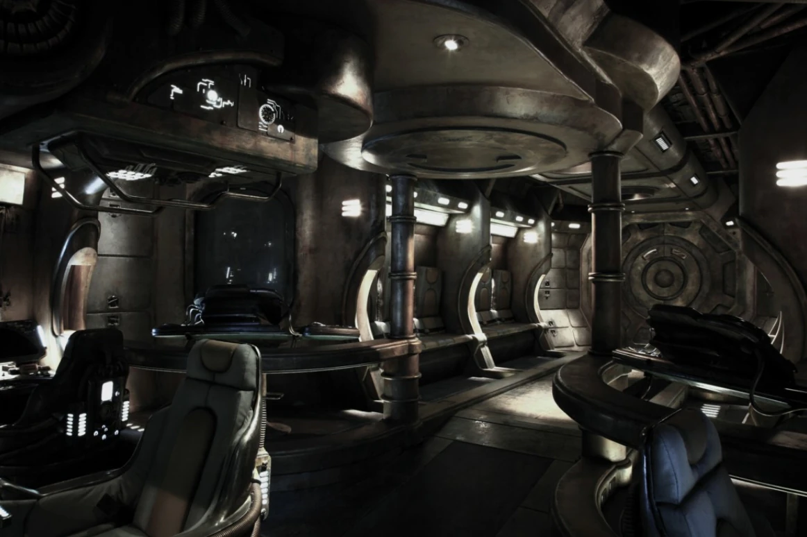 From the pilot's chair, the pilot has access to most (if not all) of the ship's systems, allowing the vessel to be flown by a single person if need be. Directly ahead are the piloting controls, such as thrusters, inertial dampeners, autopilot, pitch/yaw, and landing gear. Above these controls are the navigational radar and a display for Destiny's jump countdown, as well as life support indicators such as oxygen level, internal temperature, and pressure. On the pilot's right side are weapons systems such as manual override, targeting and counter measures. On the left side are the ship's power systems.