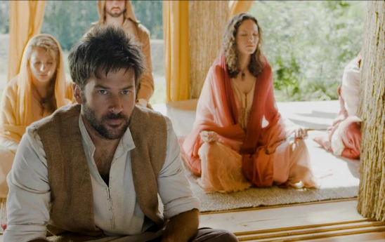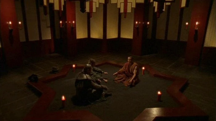 Daniel and Bra'tac meditate with a monk in a temple on Kheb.