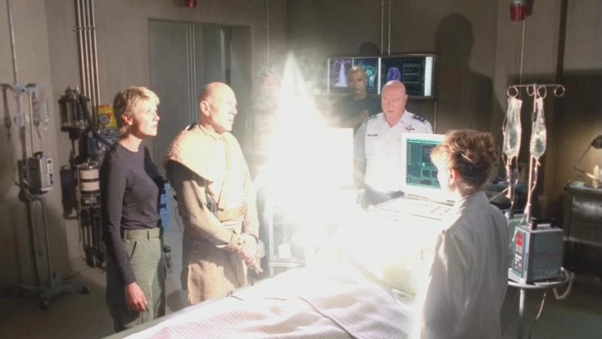 A few years later Major Samantha Carter met Orlin, an Ascended being who fell in love with her. Orlin was punished for making a weapon for a foreign race that was under attack, as the other Ascended destroyed the entire race when they began to use it as a weapon of conquest rather than for defence. Orlin de-ascended himself so he could be with Carter. He later re-ascended, presumably with help from the other Ancients, when he died as he sacrificed himself to stop Earth using the weapon for themselves. He de-ascended again later to use the knowledge of the Ancients to help Carter to cure an Ori plague on Earth, but on this occasion he turned himself into a child so that he could retain access to his full Ascended knowledge albeit without his powers, and the strain of doing this eventually left him with brain damage. (SG1: "Ascension", "The Fourth Horseman, Part 1", "The Fourth Horseman, Part 2")
