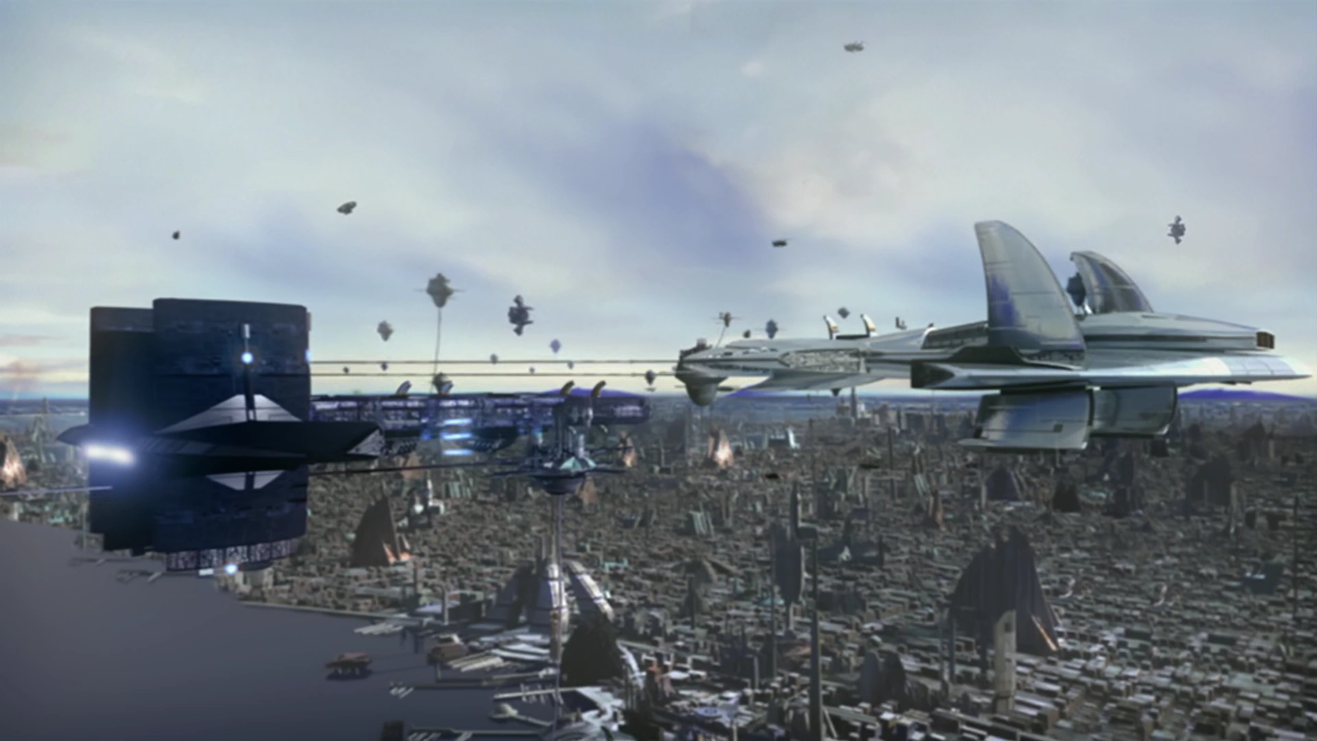 A fleet of O'Neill-class ships combat a Replicator cruiser.