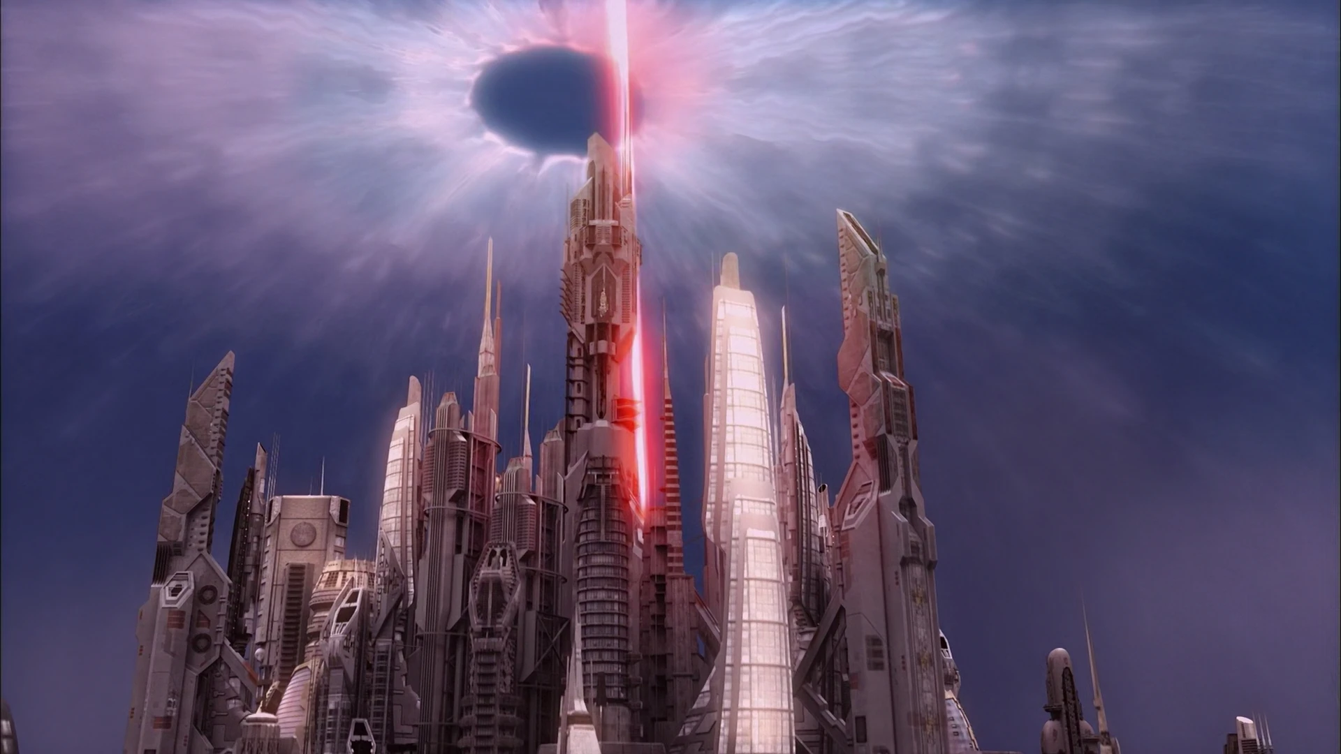 The beam grazes the Atlantis control tower.