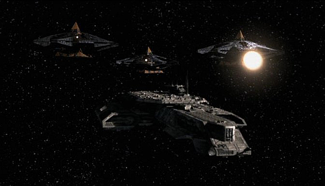 - "Fire forward rail guns at the lead ship. Looks like we're going to be testing our shields."