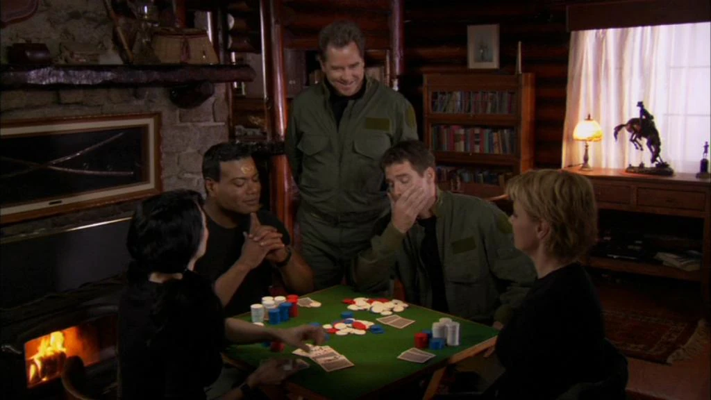He later spent his time off with Major General Henry Landry alone in O'Neill's cabin. However, at the same time, interdimensional parasites from the Sodan invisibility devices, which were used by The Trust to spy on Mitchell and Landry, terrorized the local hunters after taking the Minnesota wildlife as hosts. Fortunately, through tracking them, Mitchell and the team were able to dispatch them through plenty of firepower. He and his team found enough time to play several rounds of poker at the end. (SG1: "Uninvited")