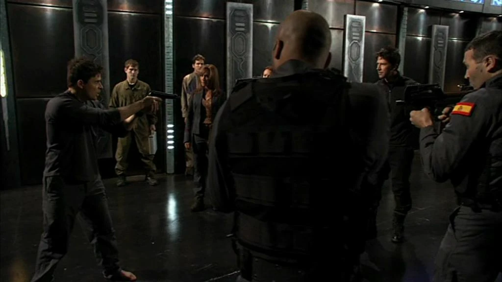 In the atrium, a dazed and tired Major Evan Lorne holds Sheppard at gunpoint, where he accuses him of being a Replicator. The surrounding armed team and Heightmeyer attempts to talk him into lowering the gun, but Lorne refuses to do so, until someone either brings in an Anti-Replicator gun, or shoot Sheppard to prove his point. Carter approaches and calls for the ARG, which might help Lorne lower his gun. However, Lorne then accuses her of being a Replicator. He is actually about to fire his weapon, when Ronon saves them both and stuns him.