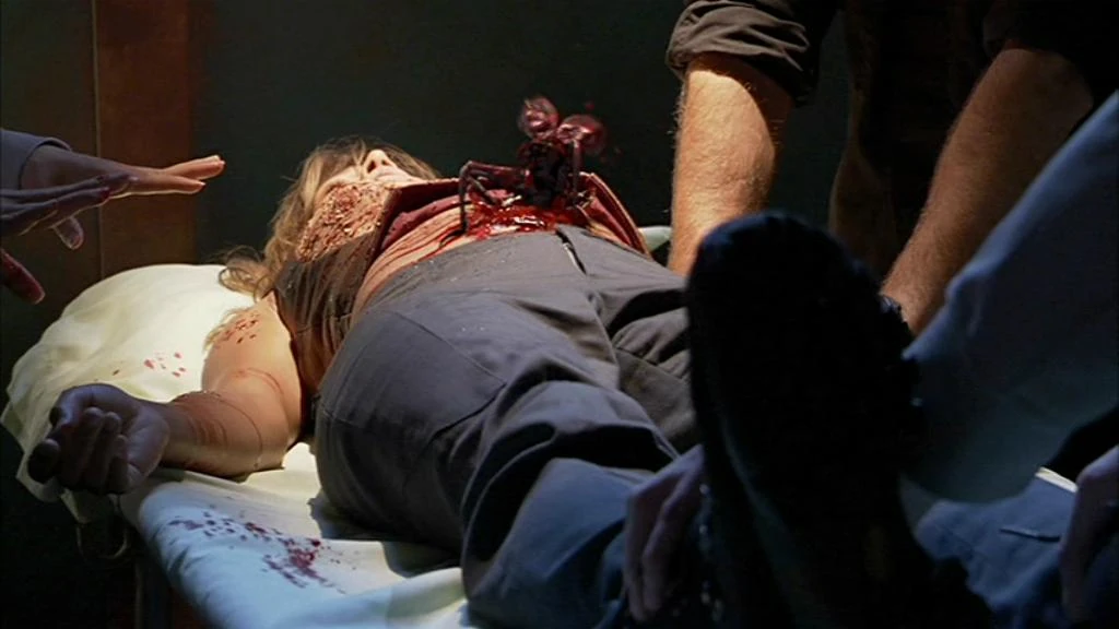 An alien insect crawls out of Teyla's stomach.