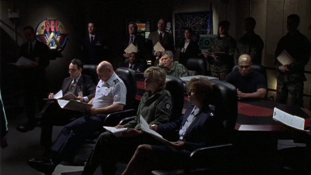 Back at SGC, SG-1 talks with Hammond about the offer, when Thor appears and says that the System Lords will appear soon to negotiate, arriving via the SGC's Stargate and that O'Neill will represent Earth.