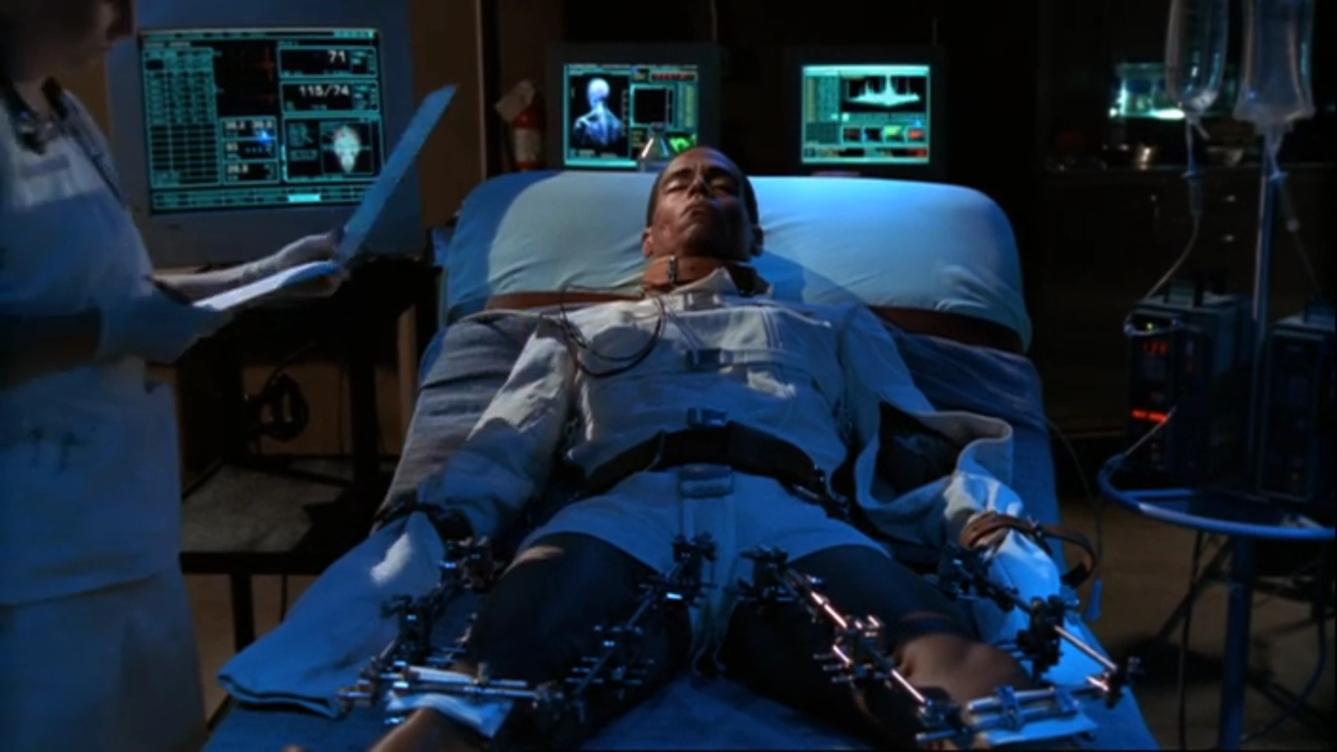 In 1999, after Apophis was tortured with a Hara'kesh and had been in a Death Glider crash, he was brought to Stargate Command after he asked SG-1 for help. Dr. Janet Fraiser took him into the OR and later informed Major General George Hammond and SG-1 of his condition, which included that both of his host body's femurs were smashed. (SG1: "Serpent's Song")