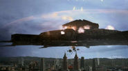 Anubis' mothership boasted a powerful energy-shield capable of protecting the vessel from even the intense bombardment of an entire Goa'uld fleet. Weapons fire that struck the shield resulted in an orange energy field extending across the craft protecting the hull from damage. However, when in the atmosphere of a planet, the shield strength was reduced to only 40% effectiveness. It was this weakness that eventually lead to the destruction of the first ship at the hands of a fleet of Goa'uld ships in orbit of Langara. (SG1: "Homecoming")
