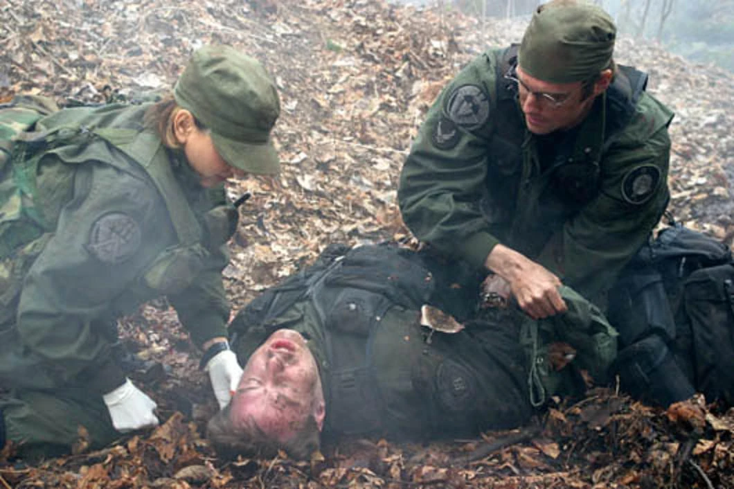 Major Samantha Carter breaks cover and rushes to Jack's aid while the gunfight rages on.