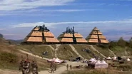 Soon after SG-1 reunites, the Jaffa find the cave where they are hiding with the Cimmerians and demand the surrender of SG-1, proclaiming that otherwise they will kill everyone and if they surrender, the Cimmerians will be allowed to live but as Heru'ur's slaves. Outnumbered twenty to one and realizing all the men, women and children will be killed if they even fight, SG-1 surrenders to spare the Cimmerians. As the Jaffa escort SG-1 to their encampment, Thor arrives in his ship, the Biliskner and attacks, sending out waves of energy that cause the Jaffa and their encampment to disappear while destroying the pyramids. However, Heru'ur escapes through the Stargate before Thor can get him too.[3]