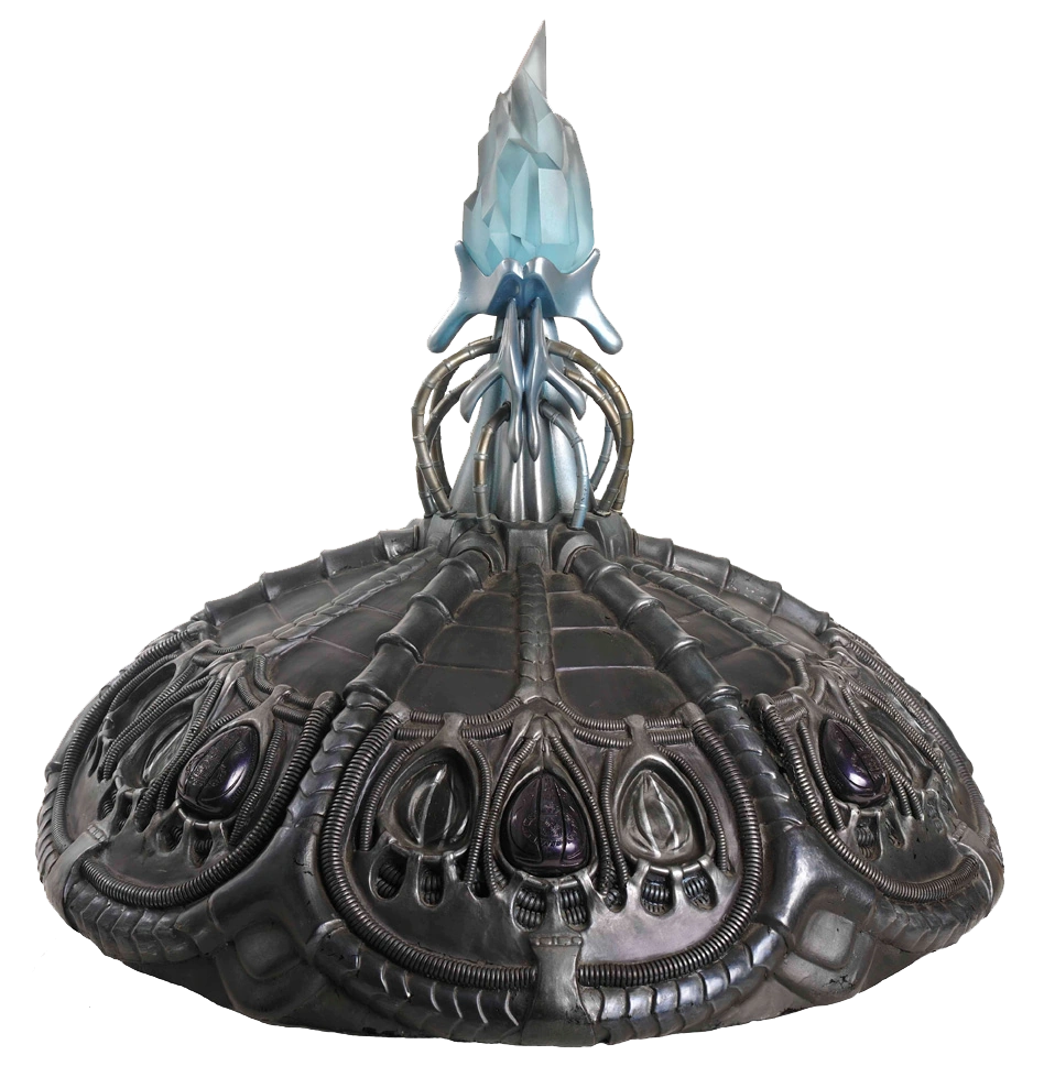 The original Alteran long-range communication device has a hemisphere-shaped base about two feet in diameter with a crystalline spire coming from the center. There are eighteen communication stone slots spaced equally around the base. When active, the spire turns blue. While the specifics of the device is unknown, what is known is that the device draws power from subspace. Once activated, the device is impossible to shut off; it has no "off switch" and any stones attached to it are locked in place. The only known method the Tau'ri have for disabling the link is to destroy the device. A Prior has been shown to be able to deactivate the device without the need for violence using his powers, suggesting that the Ancients used their own powers in a similar manner. (SG1: "Origin")