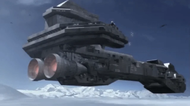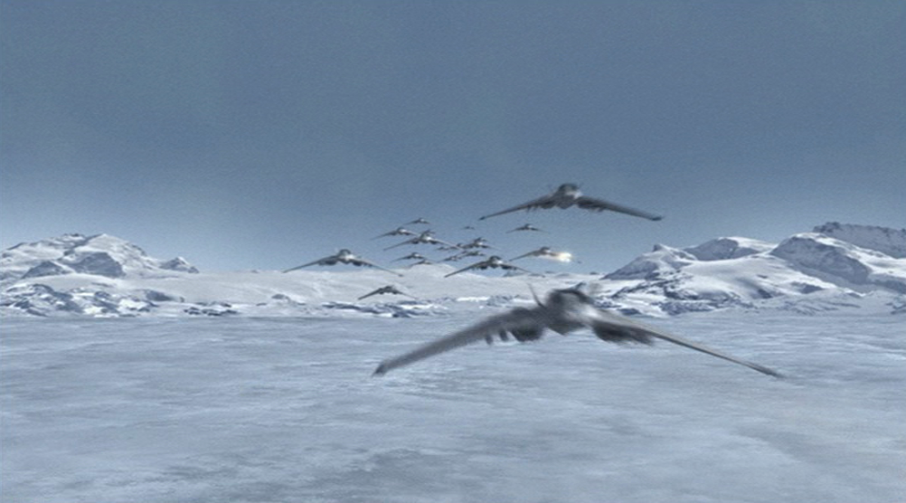 (Cut to the outside with the hovering shuttle boring through the ice with a white hot beam. In the distance a large swarm of gliders and several Alkesh bear down upon the shuttle.)