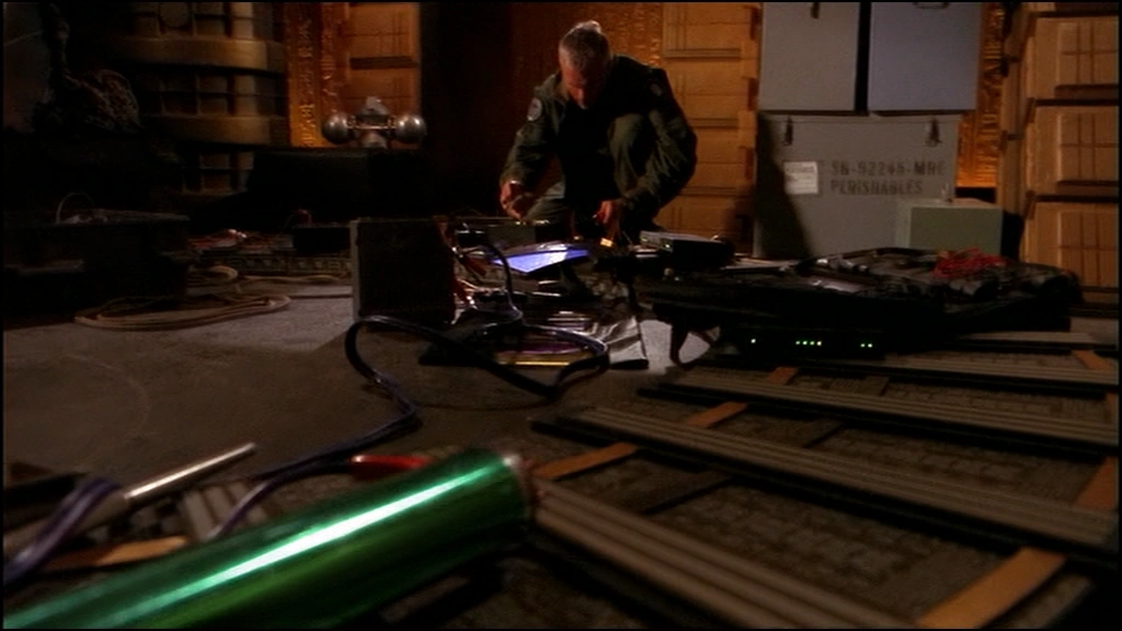 Daniel, Carter, and Weir then proceed to an SGC storage room strewn with shelves of equipment. As they enter, they see O'Neill quickly walking around the room grabbing armfuls of supplies and collecting them into a large pile. As they follow behind him while he continues, O'Neill claims that he doesn't know why he's doing it. Daniel and Carter explain to Weir that, the last time O'Neill interfaced with the Ancient repository, he similarly began doing things without knowing why and that it's likely a good sign. O'Neill asks Carter to grab a Naquadah generator before walking away to grab more supplies.