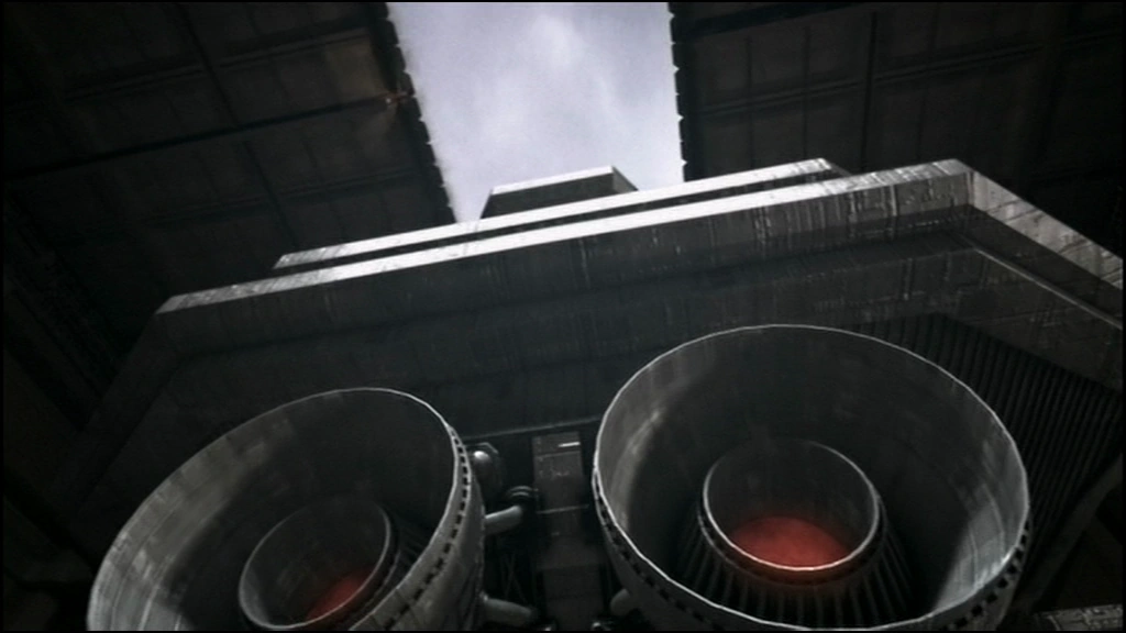 Outside, the battle persists as Prometheus continues providing cover fire. Bra'tac meanwhile breaks position and pilots the tel'tak to a less exposed location now that SG-1 has departed. On his flagship, Anubis achieves a target lock on Prometheus and orders the ship to be fired upon. Over the ice, Prometheus is now being bombarded by a fierce salvo of fire from Anubis' ship. Shields begin to weaken, with sparks erupting from several bridge consoles under the strain. Hammond orders Erin Gant to set course for Anubis' mothership. As the engines engage, Prometheus begins to climb into the atmosphere against the bombardment.