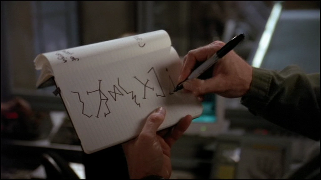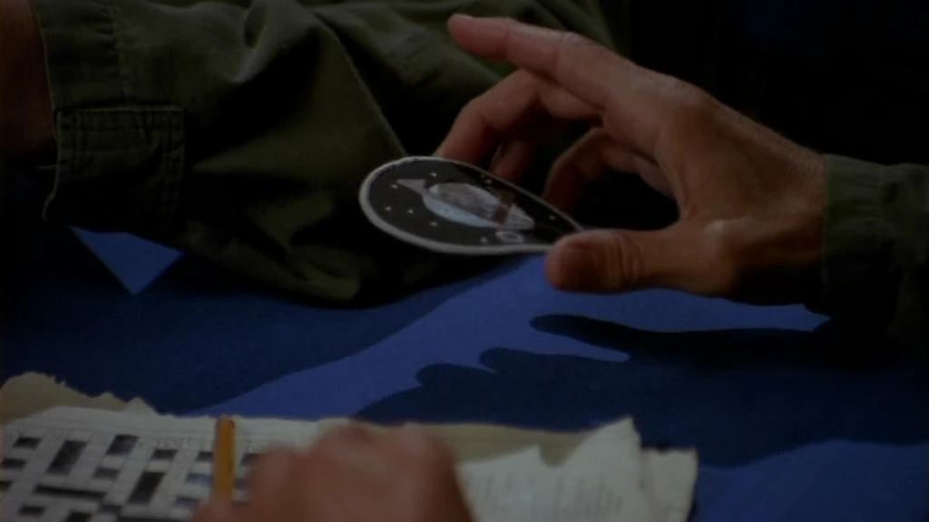 At that moment, O'Neill reaches across the table and rips off the patch containing the Point of Origin symbol on Daniel's jacket. Upon placing it on the table, the trio look at each other perplexed. O'Neill, appearing equally as confused over what has just transpired, responds that, when he looks at Earth's point of origin symbol, he feels that it means "at". Daniel thinks he understands what O'Neill is trying to say and proceeds to test his hypothesis; He searches for a blank page in his notebook in which he draws the glyph representing the constellation Orion. He shows to O'Neill, who responds by simply saying "shh". As the trio again look on perplexed, O'Neill and explains that the sound "shh" is what the symbol reminds him of.