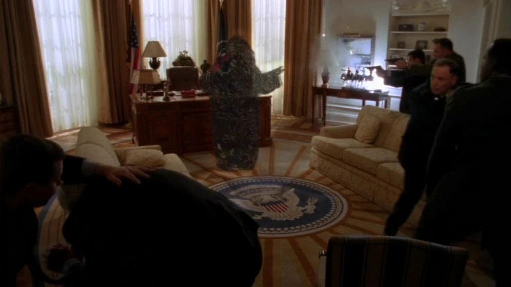 - When Secret Service agents shoot at a hologram of Anubis, they release a hail of bullets, yet cause no damage to the furniture and the room - namely the president's desk, the windows and the curtains behind it are completely undamaged.