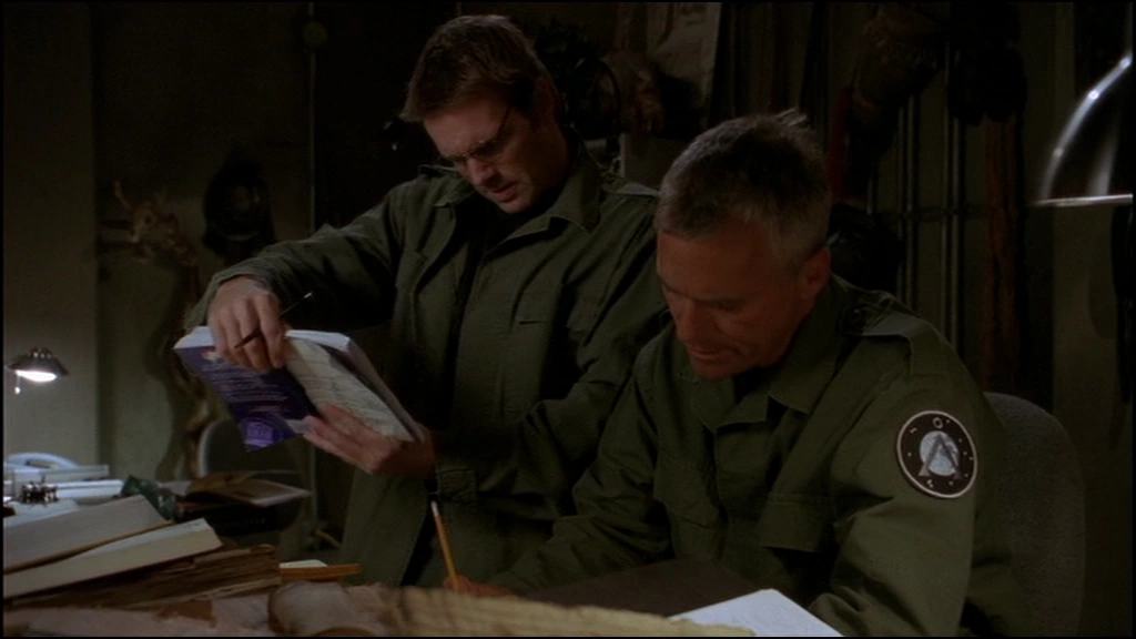 Dr. Daniel Jackson and Colonel Jack O'Neill sit in Dr. Jackson's lab. At a desk, O'Neill attempts to finish his crossword puzzle as Daniel thumbs through a book across the room. After several seconds, Daniel begins to approach O'Neill, asking if any of the words in the book look familiar to him, attempting to gauge how far the Ancient knowledge has progressed in his brain. O'Neill is uninterested, and replies that he is still unable speak Ancient. As the two talk, Daniel becomes agitated when it becomes apparent that O'Neill is unwilling to help him understand what's happening in his mind, eventually grabbing the crossword from O'Neill's hands in frustration. As he begins to inspect it, Major Samantha Carter walks in. She begins to speak but is quickly interrupted by Daniel, who notes that for the clue "label", O'Neill has inserted the answer "Praclarush" and for the clue "sphere", he has answered "Taonas". Upon realizing this, Daniel contends that "Praclarush Taonas" is the name of the planet on which the Lost City is located. Carter and O'Neill however appear skeptical. O'Neill, still appearing uninterested, walks out of the room to the mess hall with Carter and Daniel following closely behind.