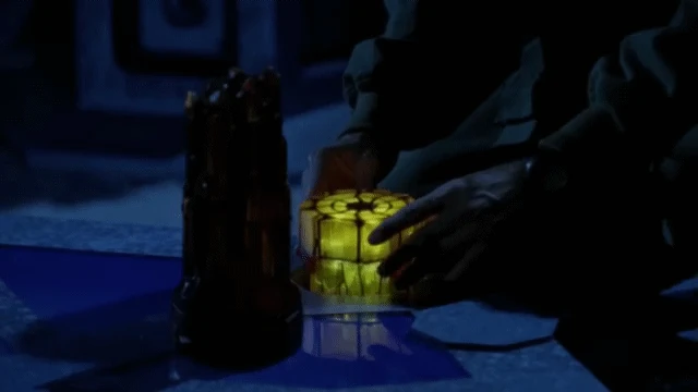 Carter then questions why they had to come all the way to Praclarush if the Lost City was on Earth the whole time. Upon hearing this, O'Neill puts the top of his hazmat suit back on and begins to stand up. As SG-1 similarly re-secures their hazmat suits, O'Neill bends down near the edge of the platform on which the chair is positioned. As he waves his hand across the corner, a small, illuminated, orange-colored device begins to rise up from the platform several inches. O'Neill pulls it out, causing the illumination to decrease and the chair to deactivate. He hands it to Carter, who identifies it a power source before placing it into a bag.