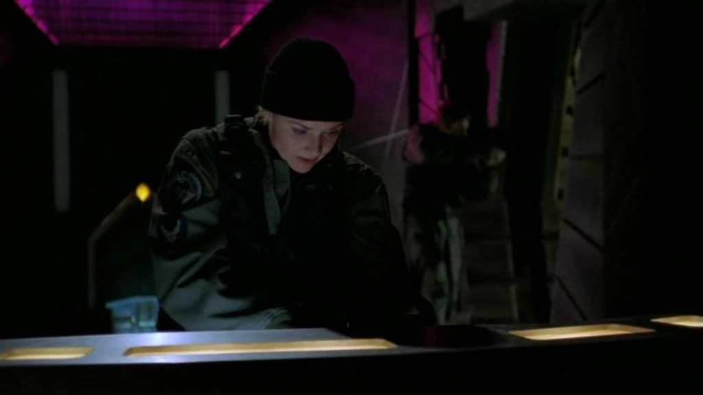 Jackson and Carter find a computer, where they are looking for any anomalies from any incoming wormholes, even though Jackson admits that he doesn't know what to look for, since he still has lost a lot of his memories. Carter leaves him alone so he can continue looking through any anomalies. Some time later, Fraiser tells Teal'c that he has finished his recovery, and has lifted more weights than anyone else, "alien technology not withstanding" (a reference to the Season 4 episode "Upgrades"). However, Teal'c goes to another machine and continues his exercise, despite the fact that he is cleared for active duty. Teal'c tells Fraiser that he is not ready.