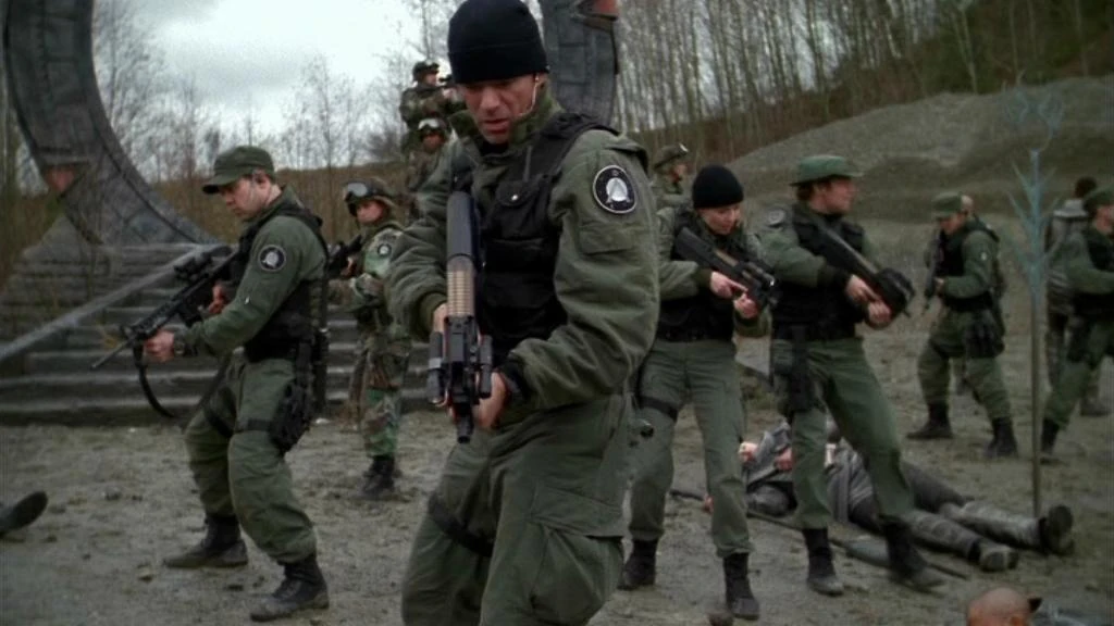 - According to the DVD Commentary, Colonel Jack O'Neill was only sniping the Jaffa at the upper torso area because of the limits on violence in television shows.