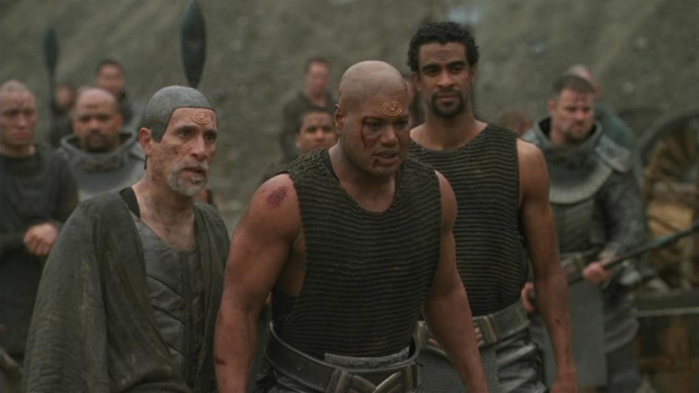Back at the tent, Bra'tac has recovered much of his strength. He notices Teal'c's lack of confidence, and tells him that the true strength of a Jaffa warrior is from his heart and mind, not muscle. After a while, Teal'c's confidence returns. Meanwhile, Rya'c goes to other slaves and spreads the word that there will be an uprising. However, the guards notice that he is away from his workstation, and he is to be executed for being out of place. Just as he is about to be, Teal'c stumbles out and begs the Jaffa leader to take his place, saying that Ray'c is still strong and can work. Before he is to be executed, the Jaffa taunts Teal'c about the fact that he was once the First Prime of Apophis and is now a weak, pathetic shol'va. The overseer says it was a good trade, since Teal'c probably wouldn't gave lasted through the day anyway. Fortunately, before he is executed, the C-4 goes off, and they witness the Ha'tak dropping out of the sky. As the Jaffa rush to the location, they are ambushed by mortar fire from the SG teams. Carter and Jackson return, while O'Neill picks off the Jaffa with his rifle.