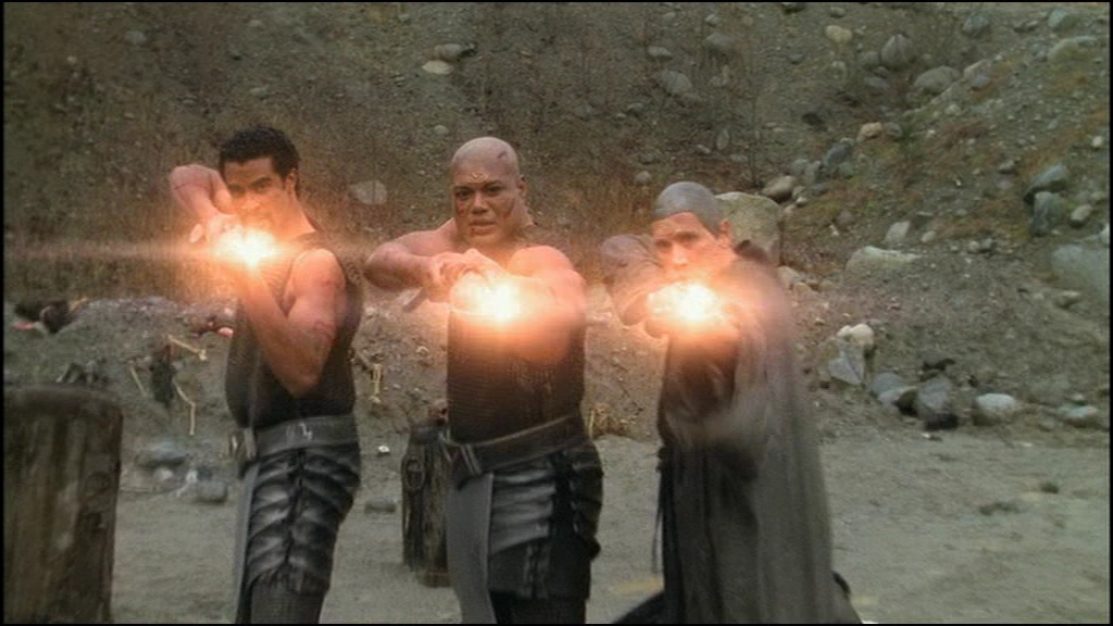 Teal'c, Rak'nor and Bra'tac pick up staff weapons, and aim at some more oncoming Jaffa.