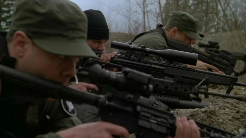 - When O'Neill is sniping, the soldier to his right is firing a weapon equipped with a PVS14 night vision monocular. In reality, the soldier would have absolutely no way to aim, because the PVS14 doesn't have any sort of aiming reticule (such as a red dot or crosshairs). Additionally, using this optic during daytime is a great way to wear out an extremely expensive piece of kit.