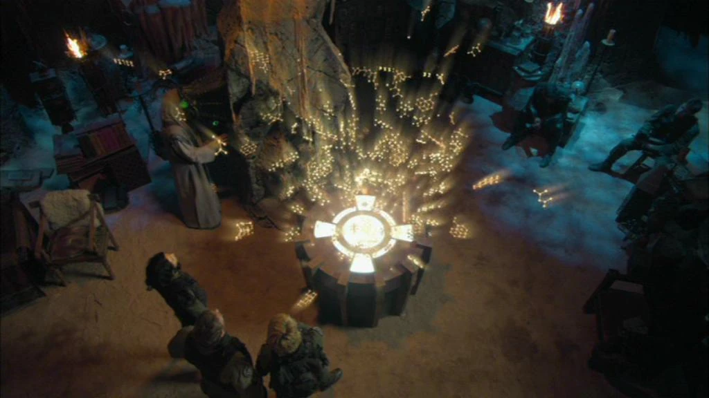 Merlin is released from stasis, and mistakes the party for some of the Knights of the Round Table. Ba'al begins to complain and Merlin literally silences him with a wave of his hand. Daniel explains that they are not the Knights and also the current situation with them and the Ori. Vala and Daniel remain with Merlin while the rest scout the area. They discover that they have changed locales and now find themselves in a desert environment not the verdant environment they were in prior. Teal'c remains outside while the others head back in to tell Vala and Daniel the news.