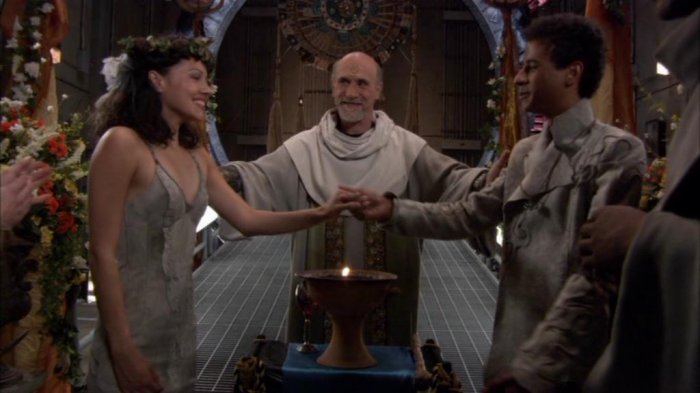 Carter reports that they have scouted a planet Ishta may be comfortable with, but that it will take about a week to set up a livable camp, meaning the wedding will still proceed on-base. Therefore, Bra'tac begins preparations, including a practice session of the ceremony. It is then that Rya'c and Kar'yn's beliefs are revealed to differ considerably. Kar'yn refuses to kneel before her would-be husband, and Rya'c is unable to put up with her aversions from the old ways.