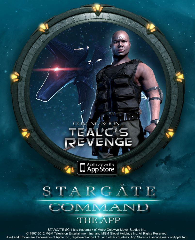 Teal'c's Revenge is an iOS and Android app that was released on December 13 2012 by Arkalis Interactive through their Stargate Command app on iOS devices. Player's control Teal'c in two modes by use of the device's touchscreen.