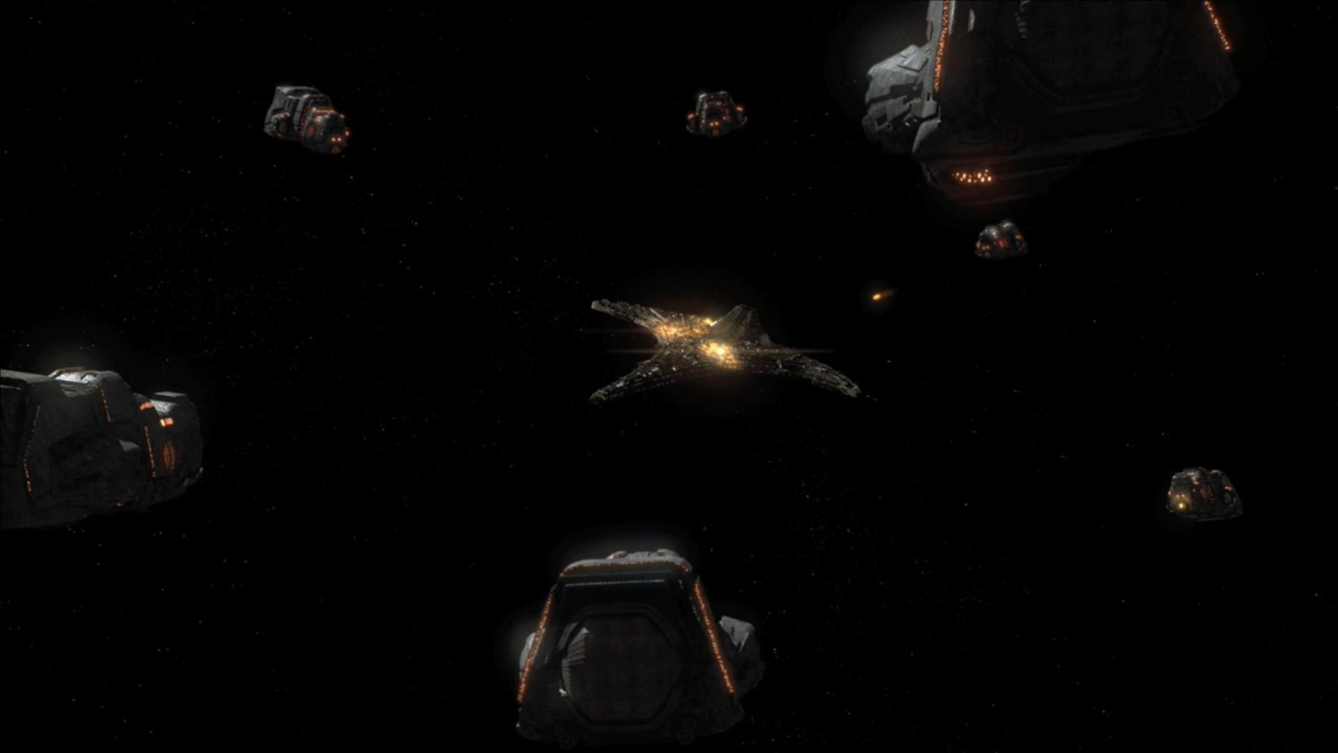 Destiny will not return to FTL for another 44 minutes, so Young orders Brody to arm the weapons. The aliens immediately open fire. During the attack, Scott and Greer herd the crew to their designated areas. Dr. Nicholas Rush enters the control room, wanting to know what's happening. He complains that they can't take on so many ships. Brody notes that the aliens want Destiny and wouldn't destroy it, but Rush counters that they could do so unintentionally by trying to collapse the shields to enable boarding. On the observation deck, Scott watches the alien attack. Some of their shots are getting through the shields. One hit causes a large piece of debris to impact the window, cracking it. He immediately orders the entire section sealed, having accepted his fate. As Young asks for an explanation, Scott is ejected into space when the glass shatters. The continued fire on the shields causes secondary explosions in the engineering section. An overload occurs in the sublight drives. The emergency shutdown is unable to stop it, and the overload consumes Destiny. Young wakes up, having dreamed the entire thing.