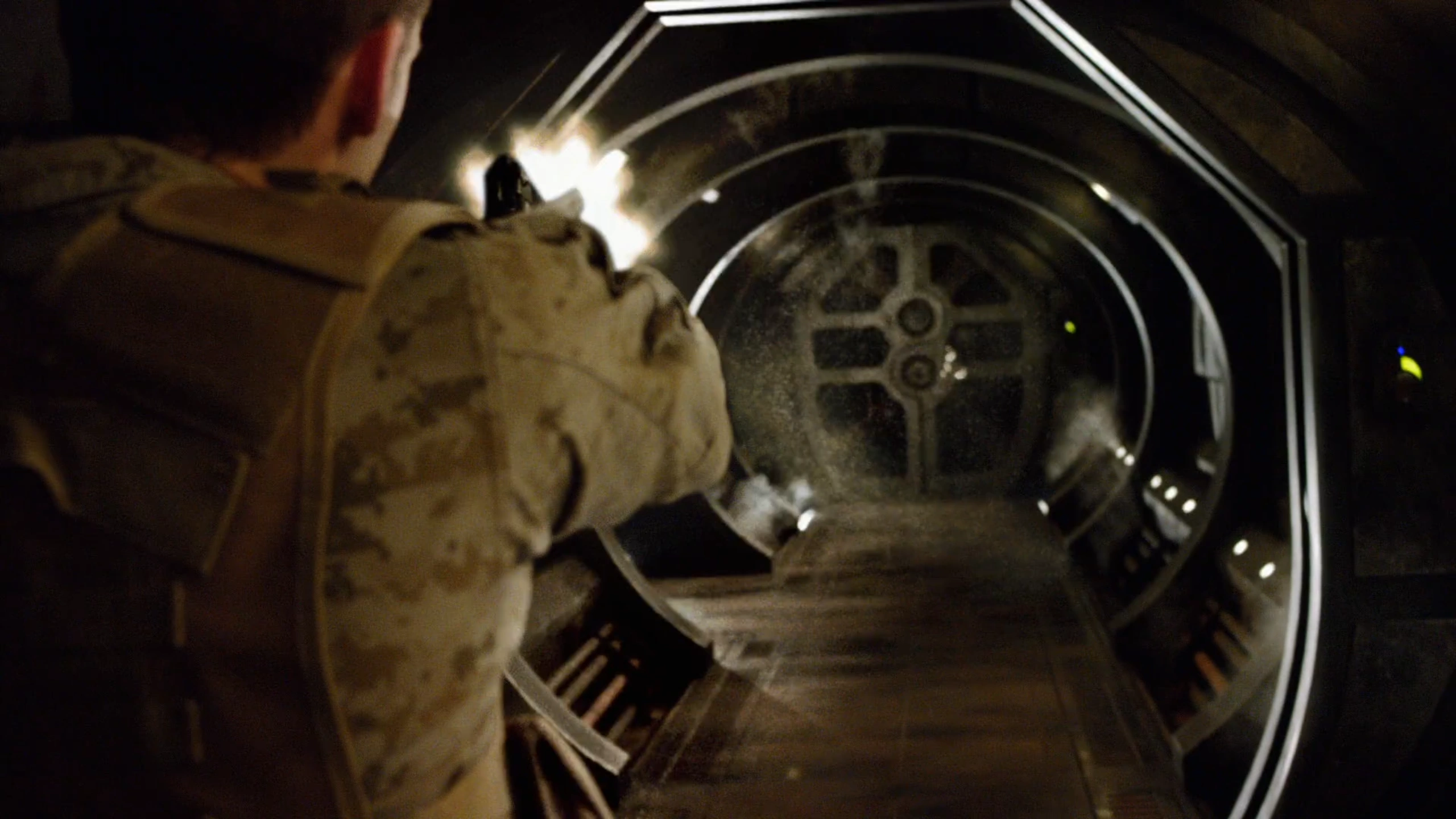 Young and Scott have packed what they believe to be enough ice to bring back with the hover board. As they return to the Stargate, Greer calls Gorman down to the Gate room and assist. On the way, he encounters the entities, who approach him. Not knowing what they are, he considers them a threat and fires his sidearm. However, all this does is provoke the swarm. He fires more shots, but to no avail. The swarm start attacking him. In the process, they cut his skin several times, causing him a lot of bleeding.
