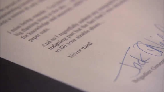 On Jack O'Neill's desk is a letter of Resignation. As the camera zooms in we see it ending with: "Never mind".